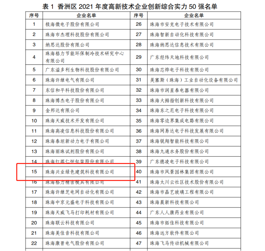 水发兴业绿建公司名列珠海市香洲区2021年度高企百强第15位