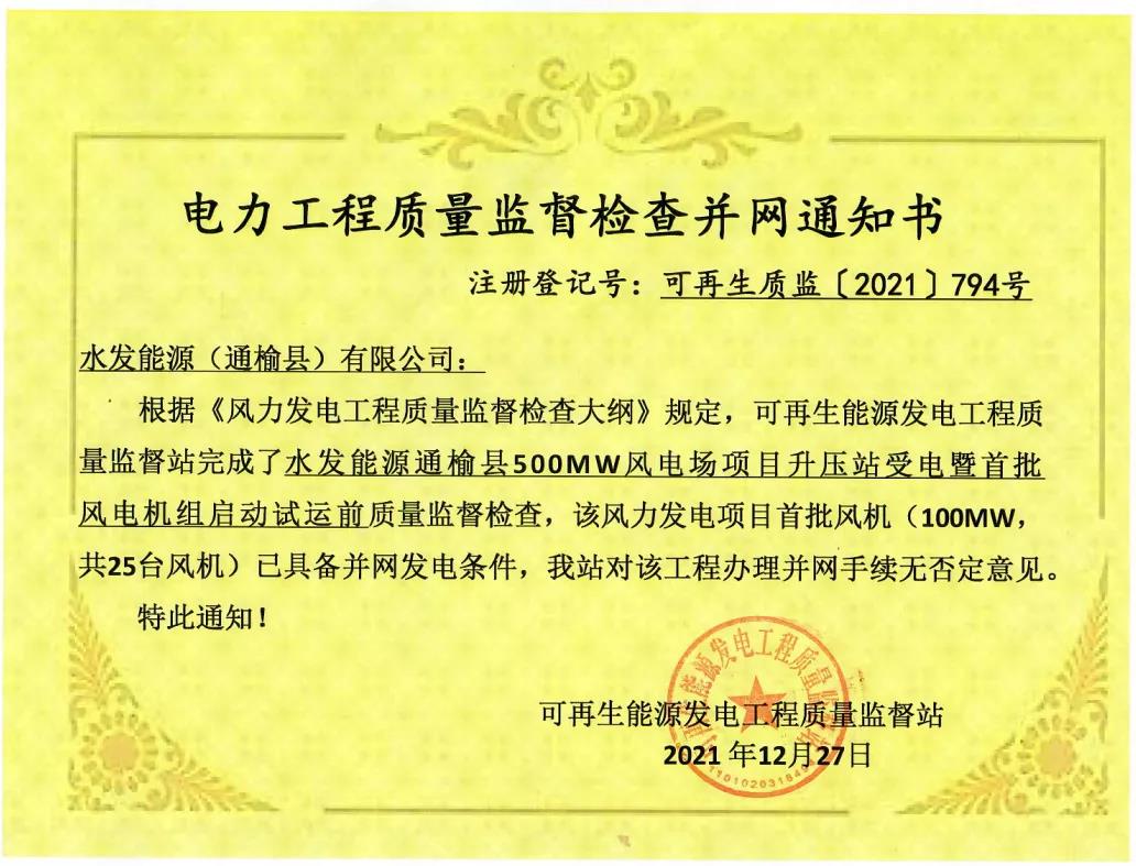水发能源通榆县500MW风电场项目获得首批风机电力工程质量监督检查并网通知书